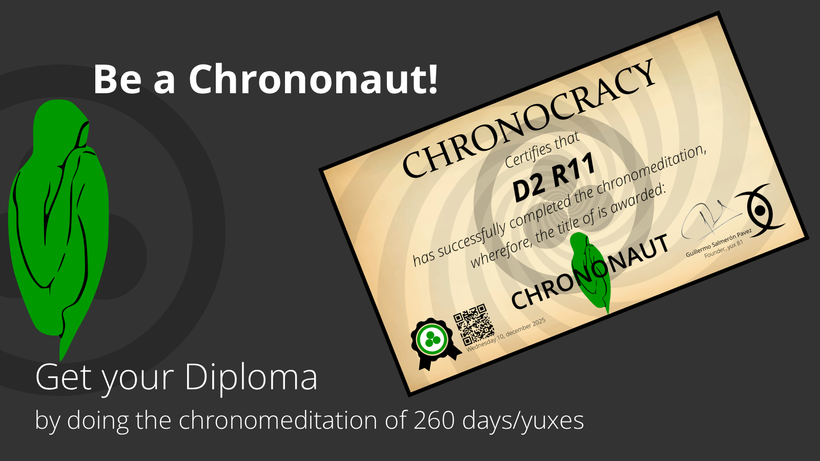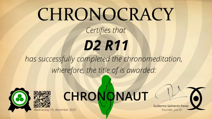 Diploma: If you successfully completed the chronomeditation, we will contact you via email to give you the diploma (digital). You will also get your badge which will appear on your chronopage, on your CIC (chronocratic identity credential), and when you appear in users’ searches and/or networks.